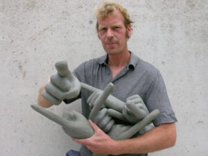 Ik maak grote mannetjes, van polyester. Dit materiaal is heel geschikt voor beelden; je kunt er vrij makkelijk ingewikkelde vormen mee maken. Het is sterk, weerbestendig. En alle denkbare kleuren zijn mogelijk. Ik maak ook kleinere mannetjes. Die zijn wat handzamer en makkelijker binnenshuis te plaatsen.